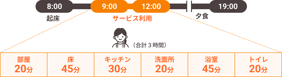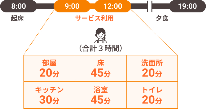- 月額基本料金=訪問時間×スタッフ人数×時間単価×訪問回数。訪問回数は1年間(52週)を12か月で割り、1か月あたり4.3週として計算をしております。そのため、月々のサービスご提供回数が異なる場合でも毎月の料金は一律となります。毎週プランは4.3週、隔週プランは2.2週の料金計算となります。